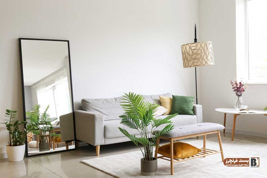 آینه های بزرگ نه تنها نور را منعکس می کنند، بلکه عمق بصری بیشتری به اتاق می دهند. نصب آینه در دیوار پشت مبلمان یا کنار پنجره می تواند فضای اتاق را دو برابر بزرگتر نشان دهد. شلف های دیواری نیز ضمن ذخیره سازی وسایل، حس عمودی و کشیدگی دیوارها را افزایش می دهند.